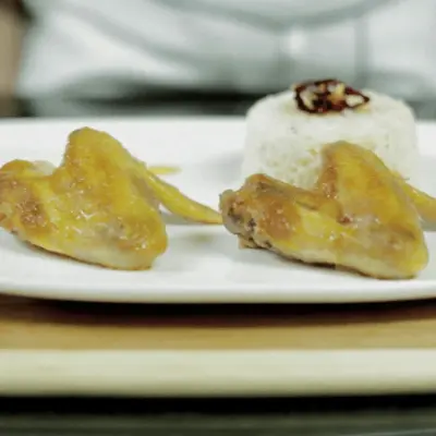 Servir una porción de arroz con alita y espolvorear el ajo y guajillo.